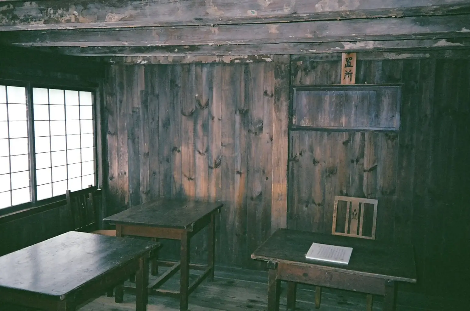 教室と言っても8畳ぐらいの広さしかなく、木札で「置所」と書かれている辺りには棚があったのだろう、いわゆるロッカーのような使い方をしていたと想像できる。