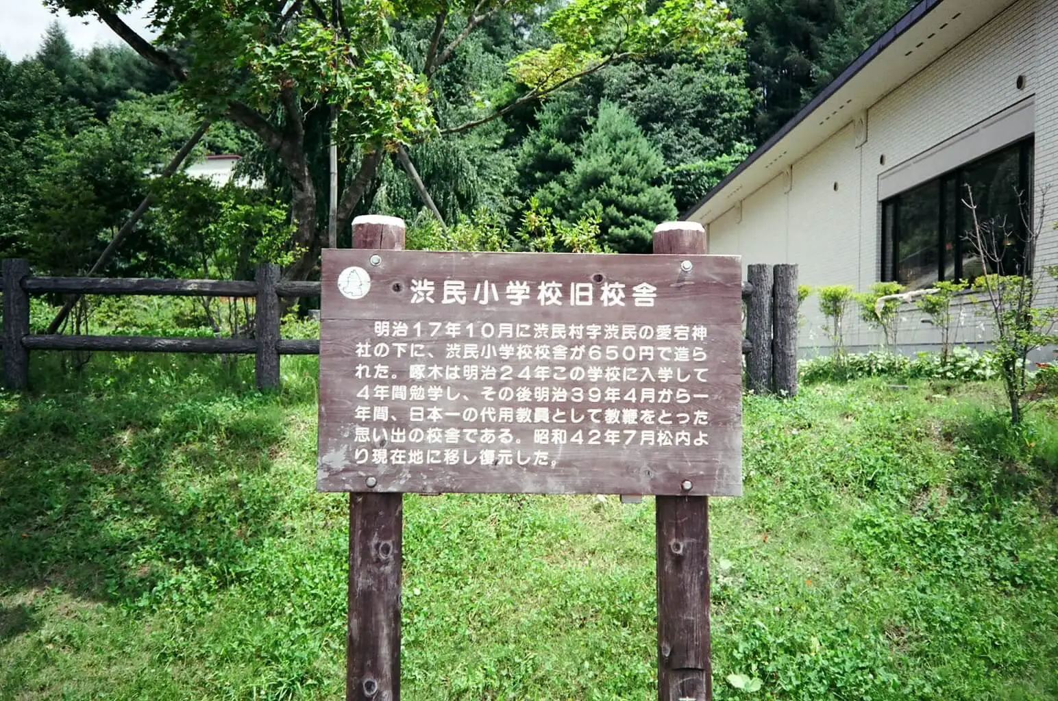 渋民小学校旧校舎明治17年10月に渋民村字渋民の愛宕神社の下に、渋民小学校校舎が650円で造られた。啄木は明治24年この学校に入学して4年間勉学し、その後明治39年4月から一年間、日本一の代用教員として教鞭をとった思い出の校舎である。昭和42年7月松内より現在地に移し復元した。