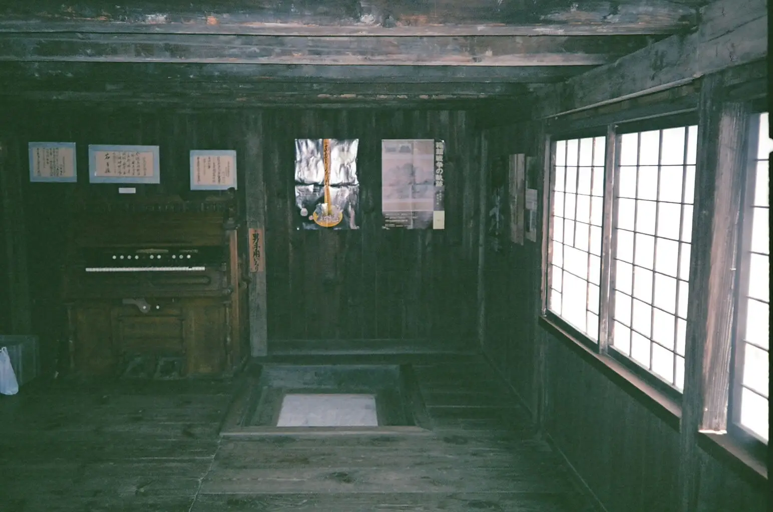 さらに右側奥を見ると、写真の古いオルガンと囲炉裏がある。柱には木札で「男子用いろり」と書かれているが、男子用の囲炉裏とはどういう意味なんだろう?