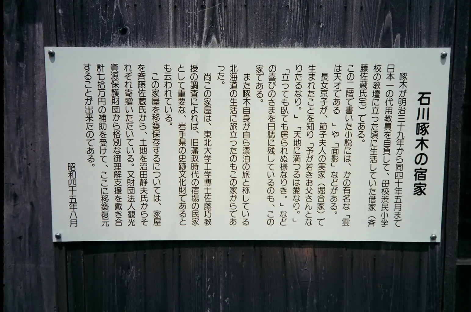 石川啄木の宿家啄木が明治三十九年から同四十年五月まで日本一の代用教員を自負して、母校渋民小学校の教壇に立った頃に生活していた借家(斉藤佐蔵氏宅)である。