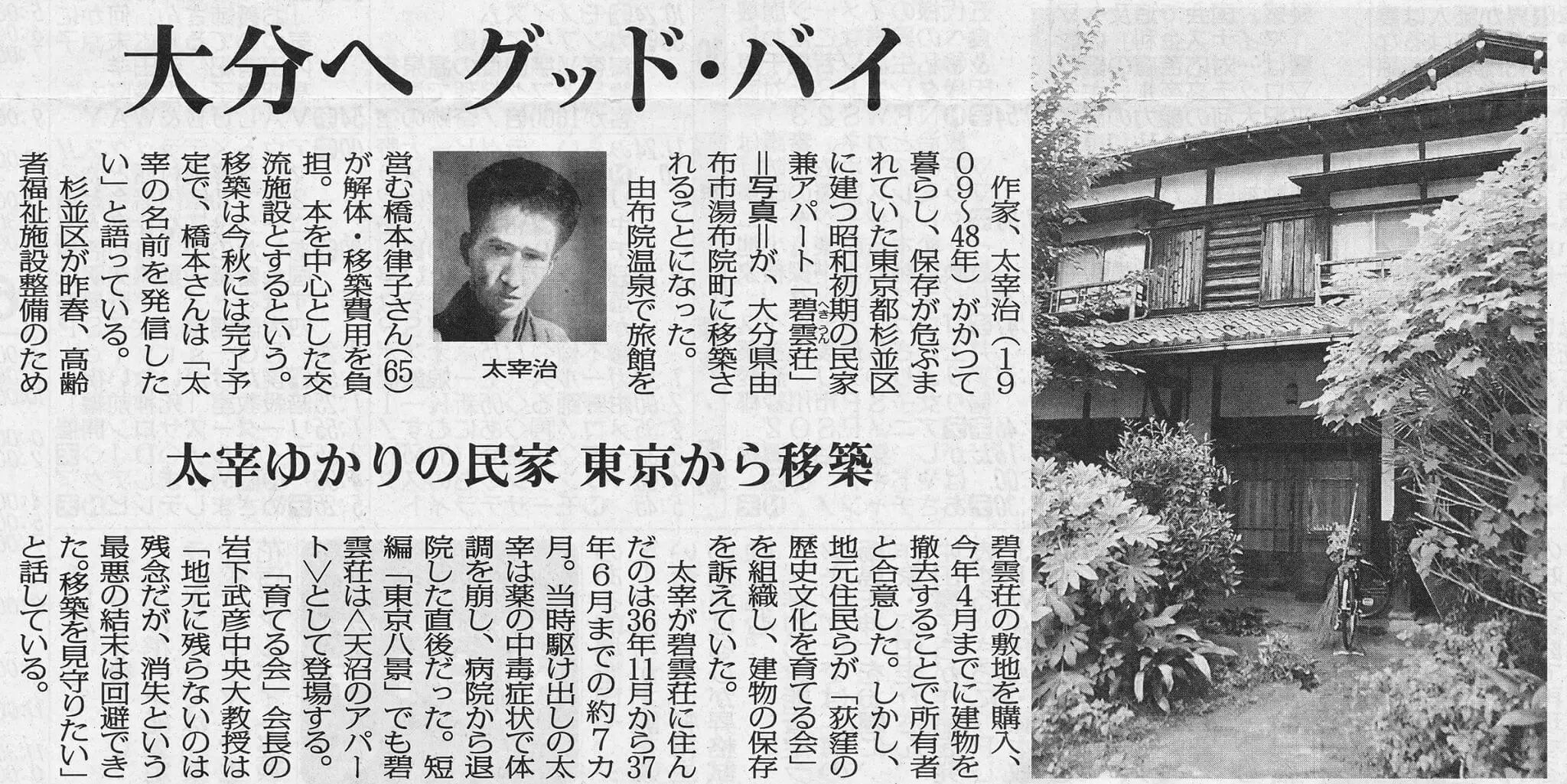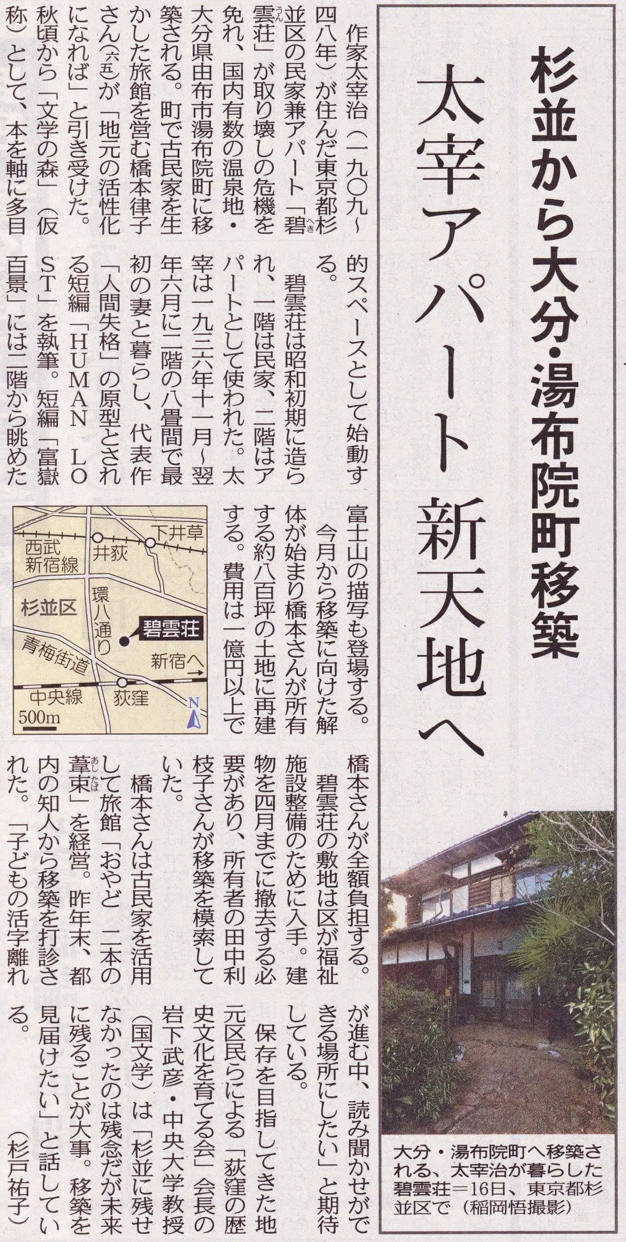 - 17日 東京新聞 朝刊 杉並から大分・湯布院町移築 太宰アパート新天地へ